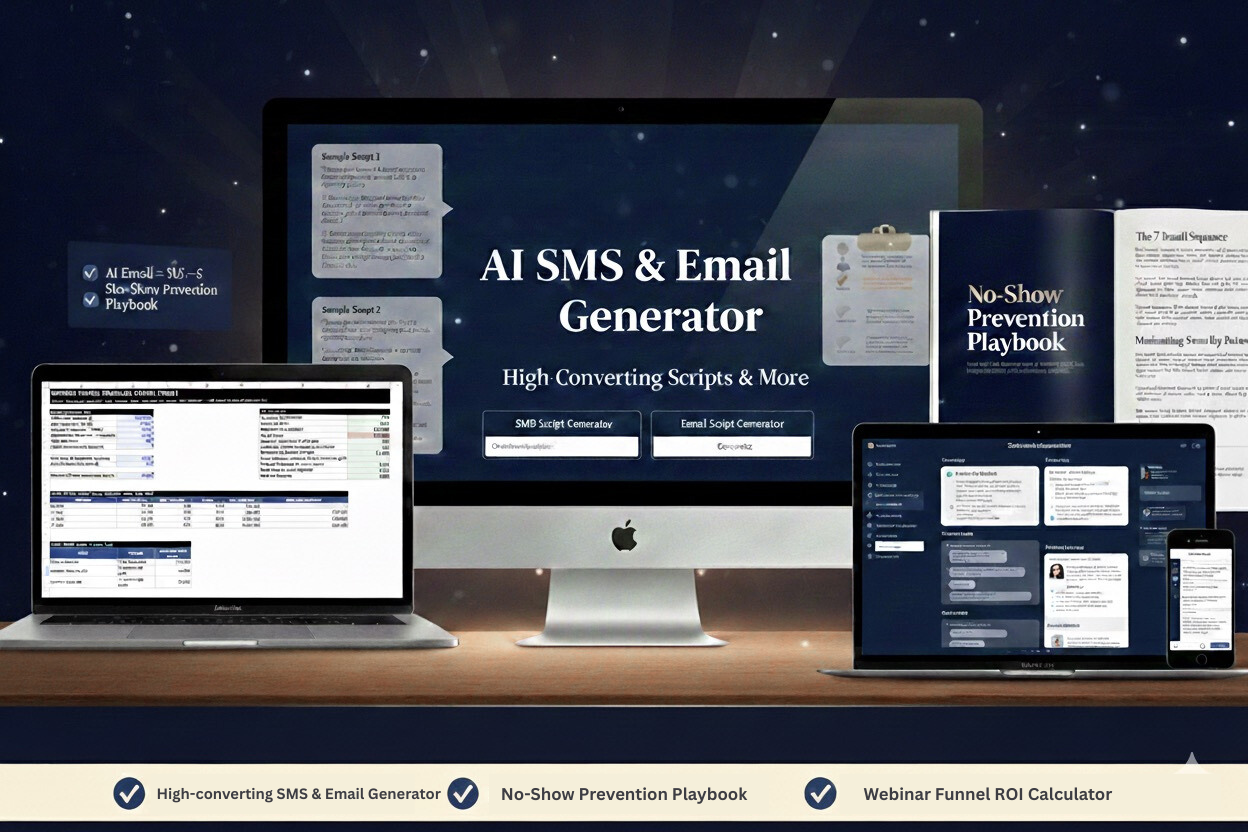 Instant access to the AI email generator. You answer 8 questions, it writes 7 complete emails + 4 SMS messages customized for your webinar. Plus the ROI calculator and No-Show Prevention playbook.